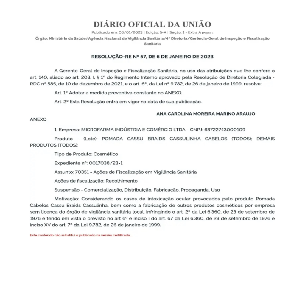 A Agência Nacional de Vigilância Sanitária (Anvisa) publicou resolução para tirar de circulação a pomada modeladora de cabeloCassu Braids e outros produtos fabricados pela Microfarma Indústria e Comércio Ltda. Só no Rio de Janeiro, mais de 200 notificações de casos de cegueira temporária e queimadura nos olhos surgiram após o uso da pomada.
