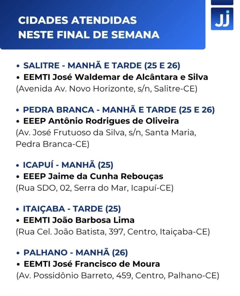 O Departamento Estadual de Trânsito do Ceará (Detran-CE) realizará, neste sábado (25) e domingo (26), o atendimento aos candidatos de Salitre, Pedra Branca, Icapuí, Palhano e Itaiçaba aprovados no programa CNH Popular, que concede gratuitamente a primeira habilitação a pessoas em situação de vulnerabilidade social.