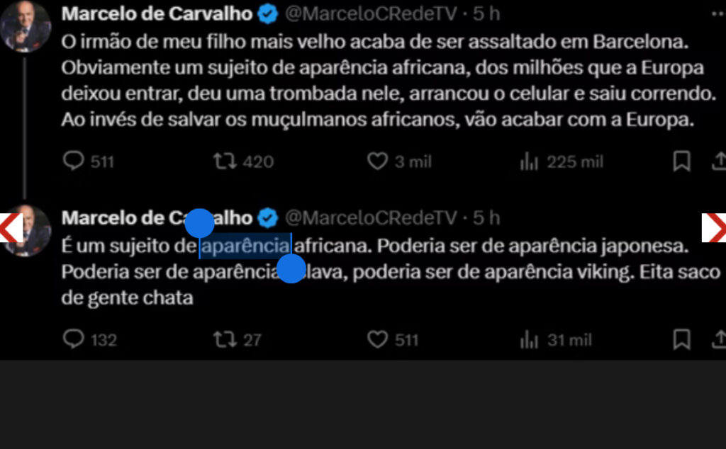 “Obviamente um sujeito de aparência africana, dos milhões que a Europa deixou entrar, deu uma trombada nele, arrancou o celular e saiu correndo”, escreveu Marcelo, ao comentar o episódio.