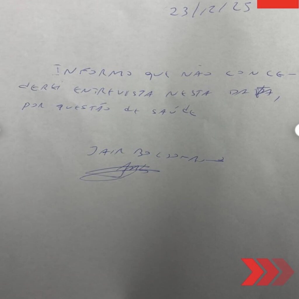 O ex-presidente comunicou o cancelamento por meio de um bilhete escrito à mão, enviado à coluna do jornalista Paulo Cappelli. No texto, Bolsonaro informou que não concederia a entrevista “por questões de saúde”.
