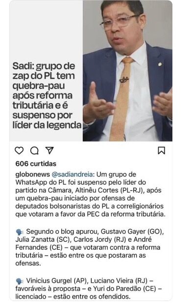 O líder do PL na Câmara, Altinêu Cortes (PL-RJ), suspendeu um grupo de WhatsApp da bancada federal do partido após troca de ofensas entre deputados. O motivo foi a votação da PEC da Reforma Tributária. Parlamentares que votaram contra a medida postaram as ofensas contra os deputados favoráveis à proposta. Cearenses do PL estão no centro da confusão. Um dos que atacaram foi André Fernandes. Um dos agredidos foi Yury do Paredão. As informações são da GloboNews.
