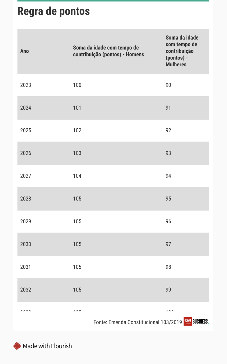 Essa pontuação sobe um ponto a cada ano até chegar a 100 pontos para mulheres, em 2033, e 105 pontos para homens, até 2028.